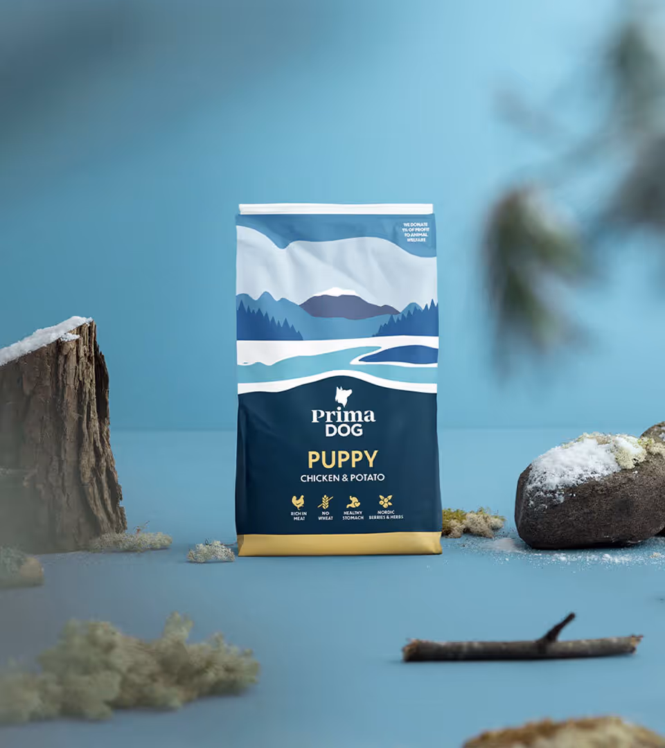 Primadog on intohimoisten koiraihmisten yritys, joka valmistaa laadukkaita koiranruokia ja -herkkuja. Tuotteet saavat inspiraationsa pohjoismaisesta elämämenosta, jossa koirilla on tilaa temmeltää puhtaassa luonnossa. Saimme tehtäväksemme toteuttaa Primadogille brändiuudistuksen ilmettä ja viestejä myöten.